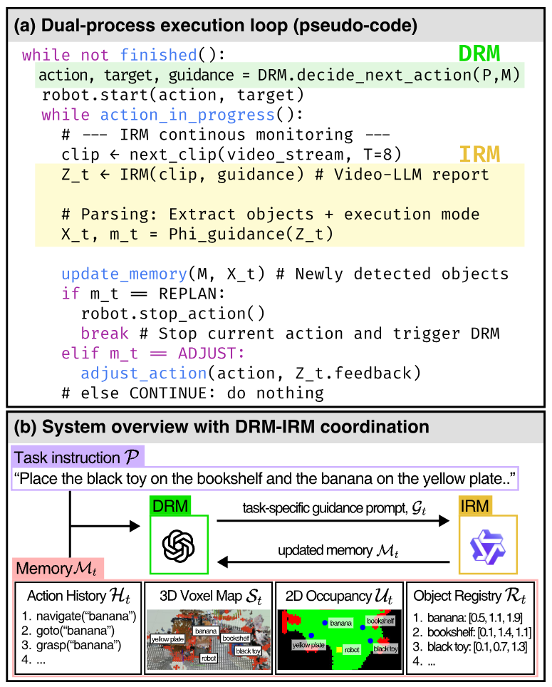 The outer loop iterates until task completion. At each step, DRM decides the next action and guidance prompt. While the robot executes, IRM monitors continuously and determines one of three execution modes: