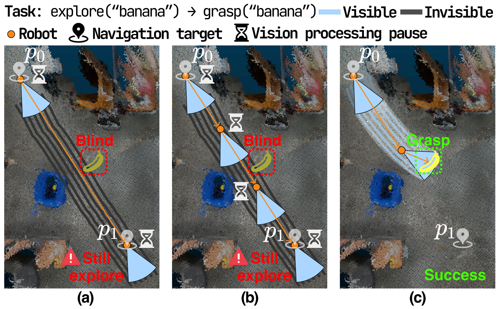 Refresh perception only upon arriving at navigation targets. If the banana appears along the path between pβ and pβ, the robot completely misses it because it never "looks" during traversal.