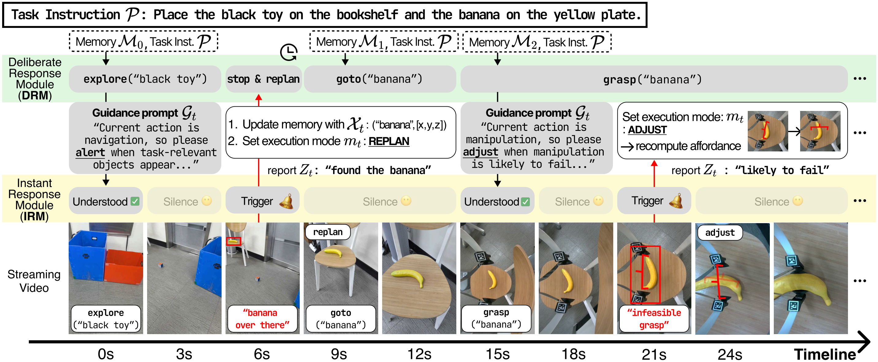 IRM monitors grasp feasibility and execution quality. Pose misalignment β ADJUST regenerates candidates locally. Critical failures (repeated fails, unavailable receptacle) β REPLAN.